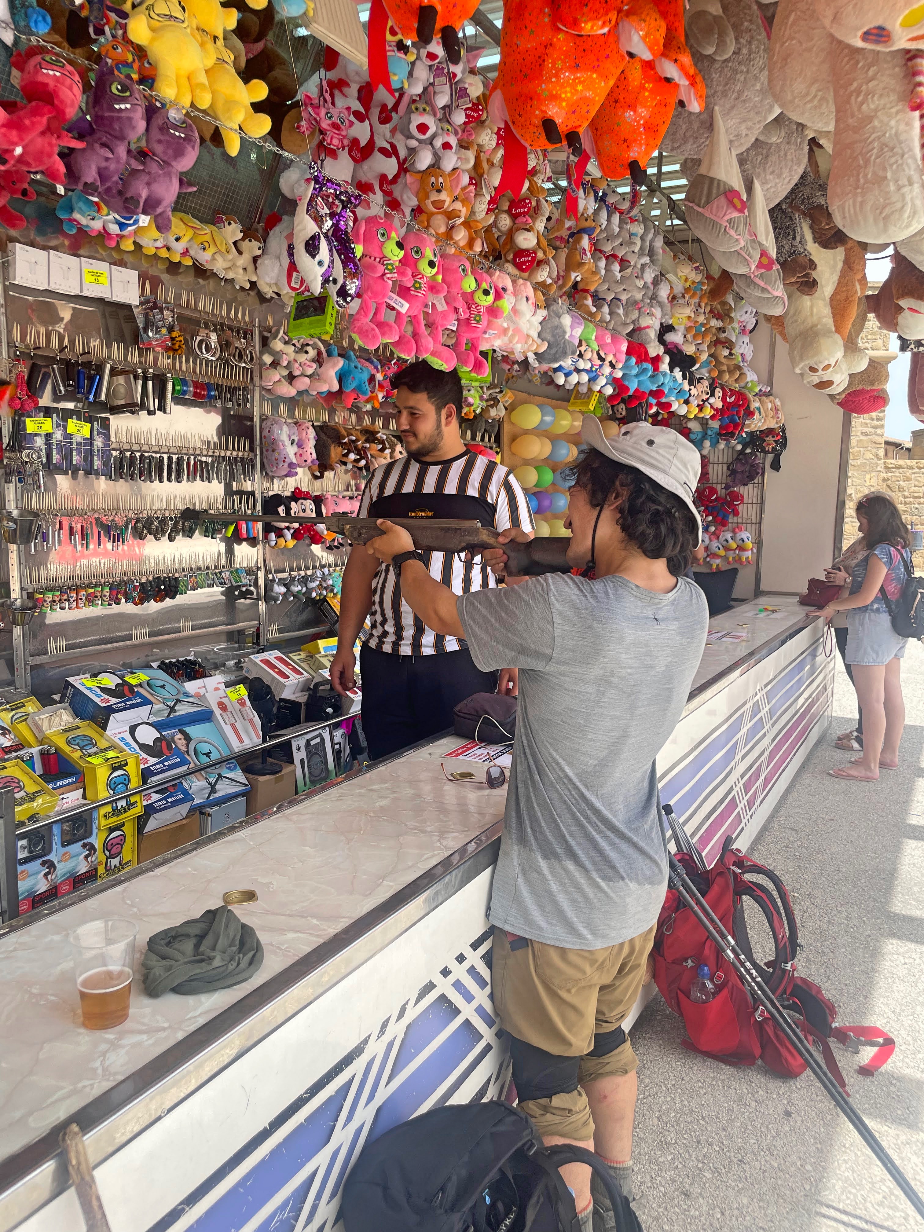 Finally, we arrived at Obanos, and a local festival was happening. We couldn’t pass the cheap beer and the shooting gallery. I shot a rifle for the first time. I wasn’t sure I had hit the target, but the guy gave me a wristband. Sadly, it wasn’t something I would proudly wear.